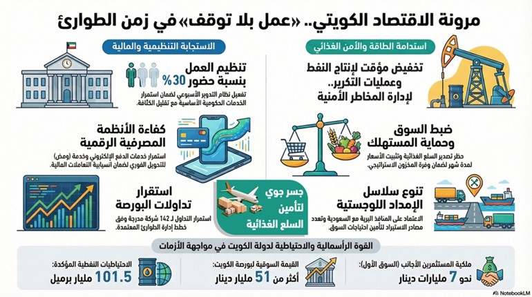 وتشير المؤشرات الاقتصادية إلى أن الاقتصاد الكويتي يمتلك مقومات داعمة للقدرة على مواجهة الصدمات الإقليمية، وفي مقدمتها قوة المركز المالي للدولة، وارتفاع حجم الاحتياطيات السيادية، واستقرار القطاع المصرفي. وفي ظل هذه المعطيات، بادرت المؤسسات الاقتصادية إلى تفعيل خطط استمرارية الأعمال وإعادة تنظيم بعض العمليات التشغيلية بما يضمن استمرار تقديم الخدمات، بما يعكس جاهزية الاقتصاد المحلي للعمل حتى في ظل ظروف استثنائية دون توقف عجلة النشاط الاقتصادي.. وهو ما نستعرض أبرز ملامحه كالتالي: