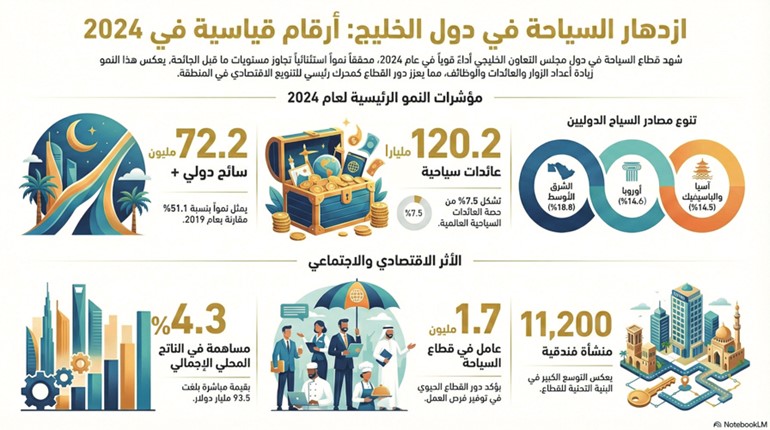 وأضاف أن هذا النمو يعكس مواصلة السياحة الوافدة إلى دول مجلس التعاون أداءها «القوي» خلال عام 2024، مشيرا إلى النمو في أعداد الزوار والعائدات والوظائف بما يعزز دور القطاع كأحد المحركات الرئيسة للتنويع الاقتصادي ودعم الناتج المحلي الإجمالي.