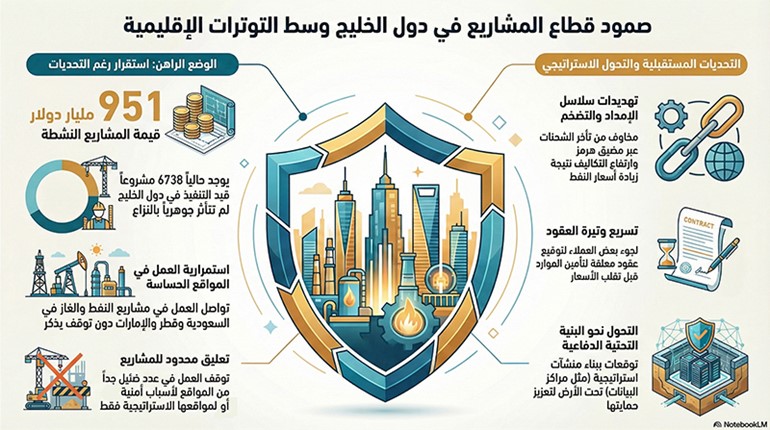 كشفت مجلة ميد عن أن تأثير النزاع العسكري الأميركي - الإسرائيلي على إيران كان محدودا على مشاريع دول مجلس التعاون الخليجي، إذ تظهر البيانات الأولية أن غالبية المشاريع في دول المجلس لم تتأثر بشكل جوهري منذ اندلاع الأعمال العدائية في 28 فبراير. ووفقا لقاعدة بيانات تتبع المشاريع الإقليمية «MEED Projects»، هناك 6738 مشروعا قيد التنفيذ في دول الخليج بقيمة إجمالية تصل إلى 951 مليار دولار. وأشارت المجلة إلى أن شركات المقاولات في المنطقة تؤكد أن أغلب مشاريعها لم تتأثر بالنزاع، واستمر العمل في مواقع المشاريع دون أي تعطيل يذكر، بينما توقفت بعض المواقع مؤقتا إما بطلب من السلطات أو بسبب مخاطر الموقع الاستراتيجي.